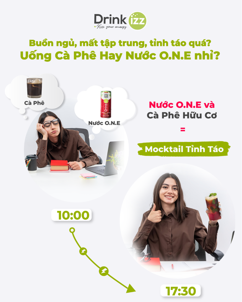 Thói quen của các bạn văn phòng yêu cafe là uống một cốc buổi sáng cho tỉnh ngủ, nhưng đôi khi hương vị cafe Robusta rất mạnh và không để lại thơm hậu vị khi pha nóng. Ngoài ra, nếu dùng cafe truyền thống thì  nhiễm chất độc hoá học tổng hợp ảnh hưởng đến sức khỏe. Như vậy các bạn thế bằng nước O.N.E thì lại cảm thấy thiếu vị cafe theo thói quen. Nên Team Drinkizz đã sáng tạo ra một món mới mocktail vừa giúp bạn uống hương vị cafe mà vừa có cả hương vị nước O.N.E, đó là Mocktail Tỉnh Táo.