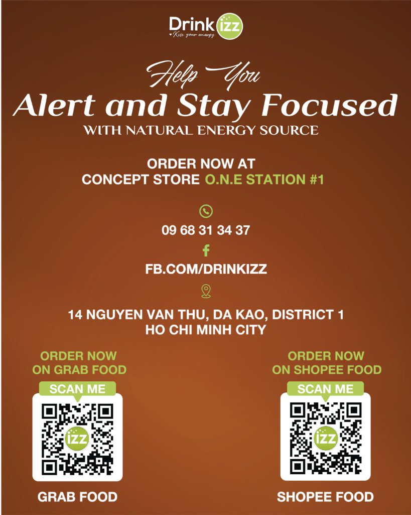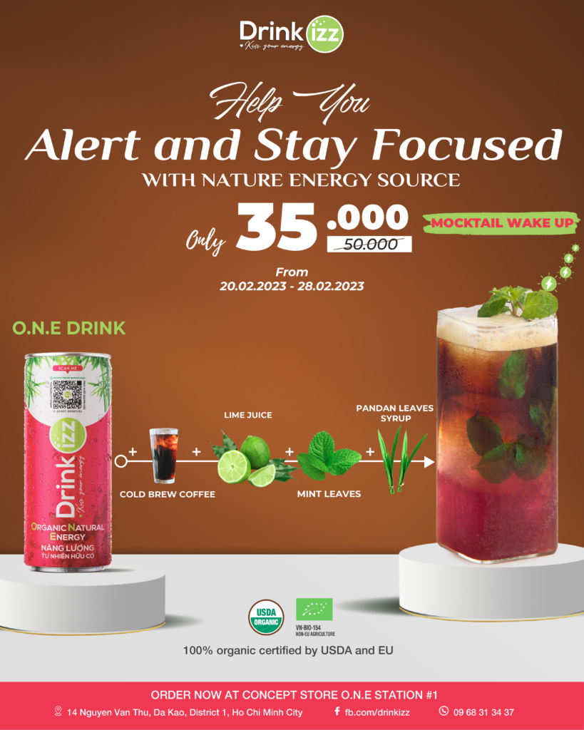 With a combination of natural caffeine from Robusta organic coffee and organic black tea, you will be awakened immediately after 10 minutes of drinking this drink. In addition to two flavors of coffee and O.N.E drink, the combination of fresh organic lemon, pandan leaf syrup, and mint leaves will bring you a captivating aroma experience from the mountains of Vietnam.